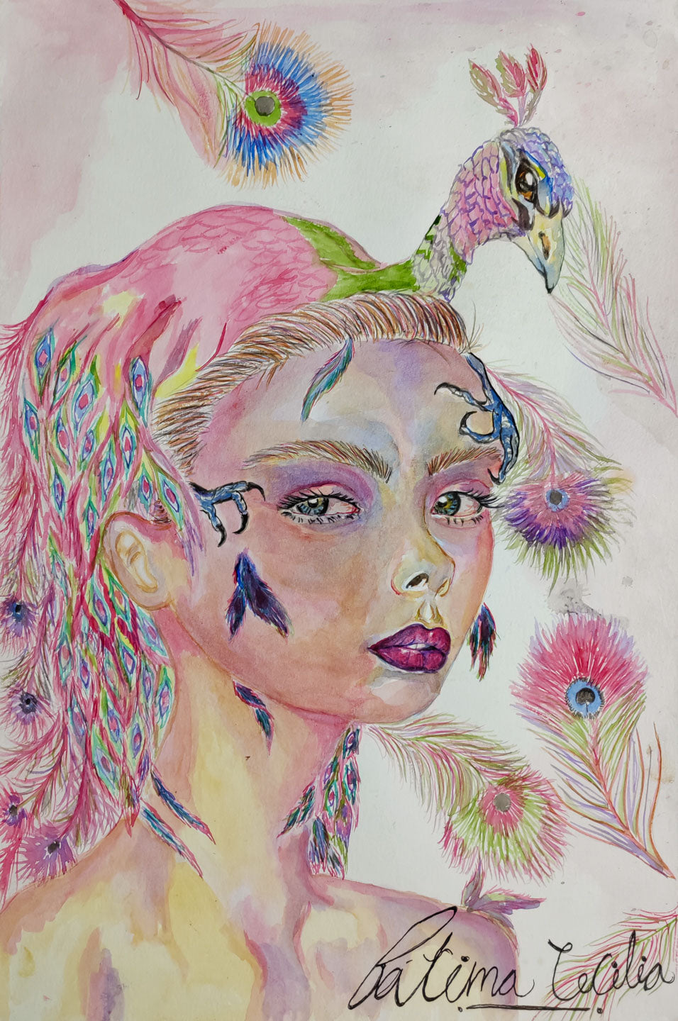 Acuarela con técnica mixta. Estética onírica, femenina y espiritual, con rasgos de realismo mágico y detalles neorrealistas. Influencia simbólica del pavo real como arquetipo de luz interior.