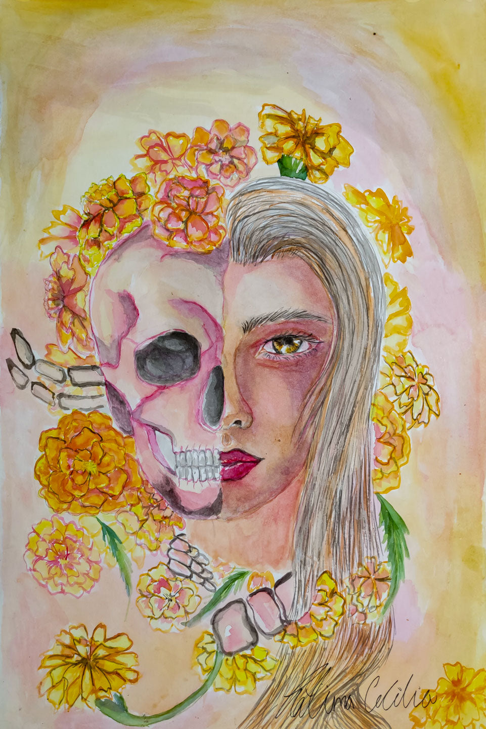 La obra no sólo honra la dualidad entre lo efímero y lo eterno, sino que también celebra la belleza de lo femenino más allá del tiempo. Las calidez de los tonos amarillos y naranjas, combinados con la precisión emocional del trazo, nos invitan a aceptar con amor la transformación, la muerte como parte inseparable de la vida.