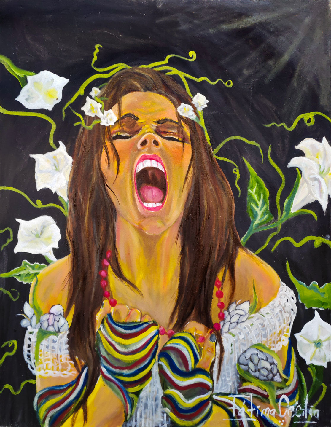 “Grito de Tierra y Libertad” es una explosión visual de fuerza femenina, resistencia ancestral y liberación emocional. En esta vibrante obra de Fátima Cecilia, artista plástica originaria de San José del Pacífico, Oaxaca, una mujer emerge como símbolo del despertar interior, gritando con el alma abierta mientras flores de datura y enredaderas brotan de su cabello, brazos y pecho.