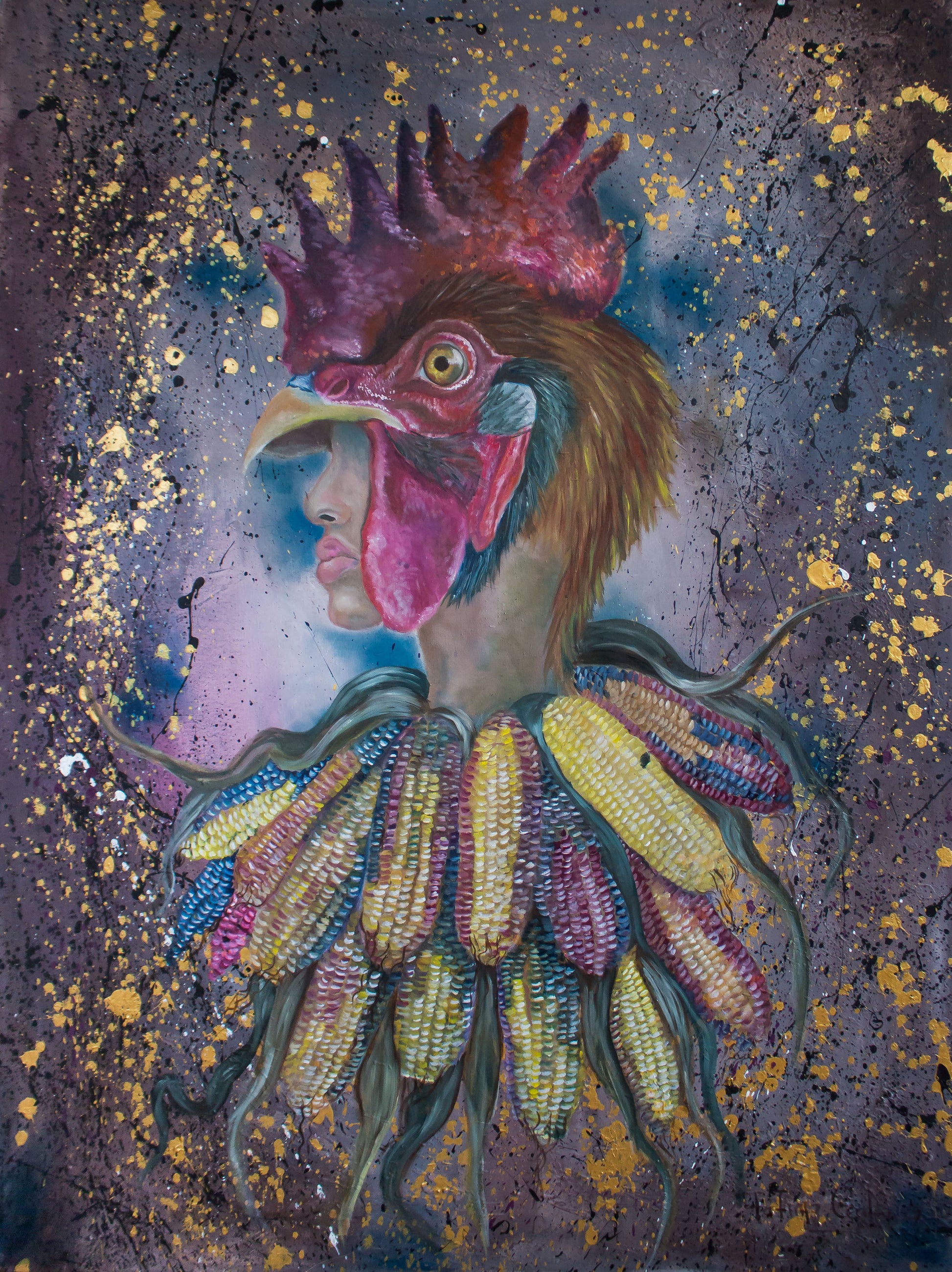 Atrévete a descubrir el poder ancestral del maíz y el espíritu del gallo en esta impactante obra titulada “Guardián del Maíz” de la artista oaxaqueña Fátima Cecilia, originaria de San José del Pacífico. Esta pieza híbrida, potente y simbólica, representa una figura mítica con rostro humano, plumaje de gallo y un penacho de mazorcas multicolores que emergen como emblemas de resistencia, fertilidad y herencia cultural mesoamericana.