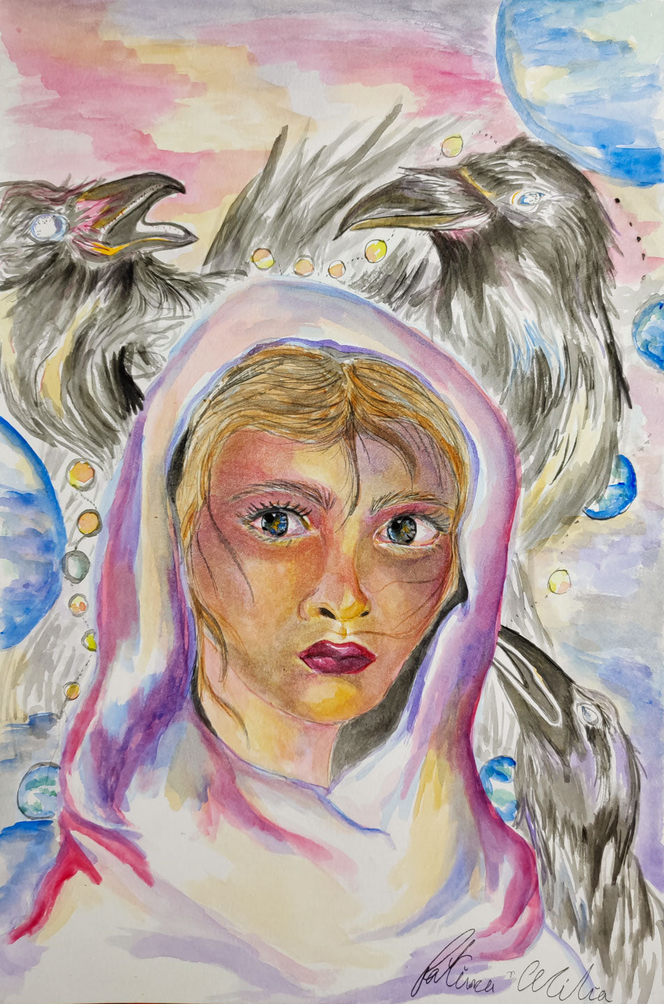 Acuarela y técnica mixta. Composición introspectiva, con estética de realismo mágico, influencia simbólica, y fondo onírico.