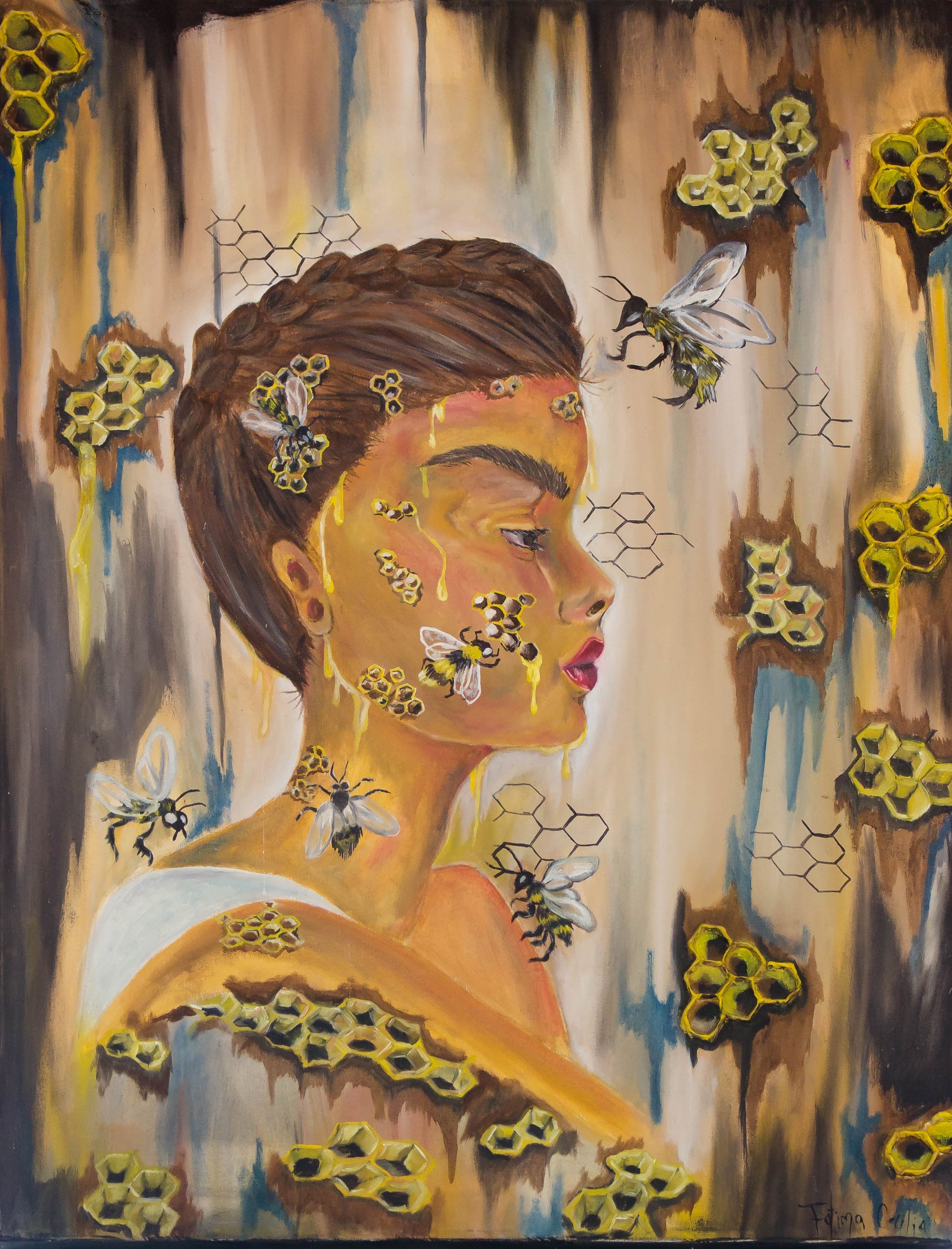 Esta pintura retrata el perfil sereno de una mujer cuya piel es habitada por abejas sagradas y panales que emergen como extensiones vivas de su cuerpo. La miel fluye suavemente desde su rostro como lágrimas doradas, sugiriendo dulzura, sabiduría y conexión con la tierra. Las abejas, guardianas del equilibrio natural, revolotean entre geometrías sagradas y texturas melíferas que evocan el trabajo comunitario, la feminidad fértil y el linaje ancestral.