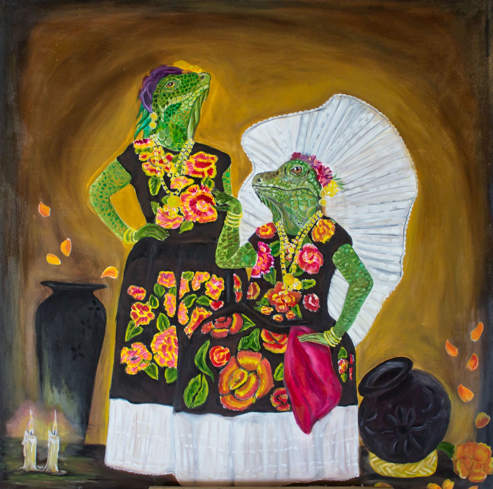 En esta escena inolvidable, dos iguanas antropomorfas posan con orgullo ataviadas con el majestuoso traje de tehuana. Sus miradas altivas, la textura de su piel verde y la exuberancia floral de sus vestidos nos transportan a una dimensión donde lo animal y lo humano se entrelazan en perfecta armonía. El fondo cálido, las velas encendidas y los pétalos caídos evocan un ambiente ceremonial, como si estuviéramos frente a una ofrenda viva a la identidad zapoteca.
