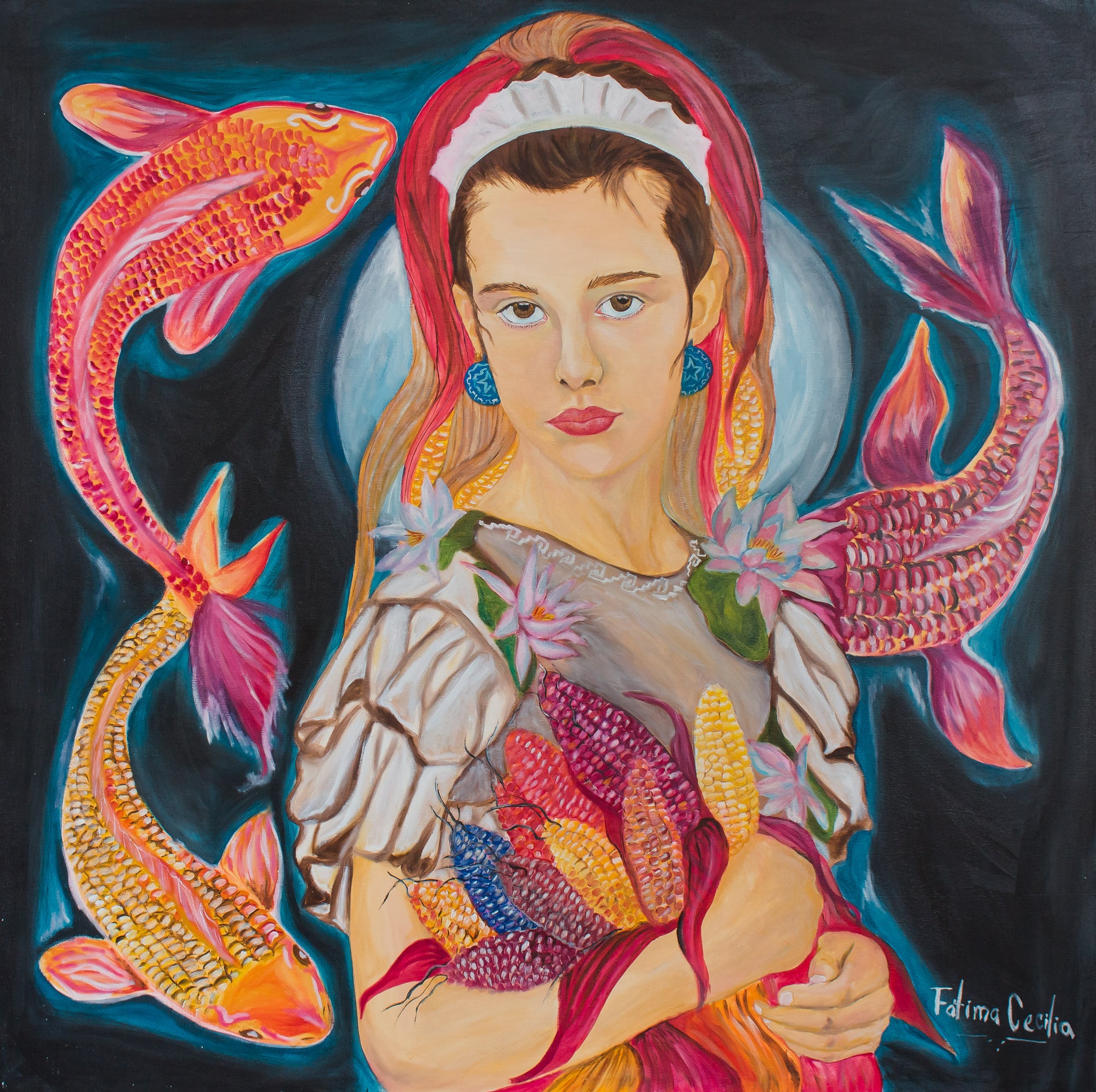 “Maíz, Agua y Mujer Sagrada” es una obra vibrante y profundamente simbólica de Fátima Cecilia, artista plástica originaria de San José del Pacífico, Oaxaca, reconocida por fusionar el realismo mágico con el arte neorealista mexicano. Esta pintura poderosa retrata a una joven mujer vestida con atuendo ceremonial, rodeada por peces koi danzantes, mientras abraza con firmeza mazorcas de maíz multicolor —símbolo de vida, abundancia y herencia mesoamericana.