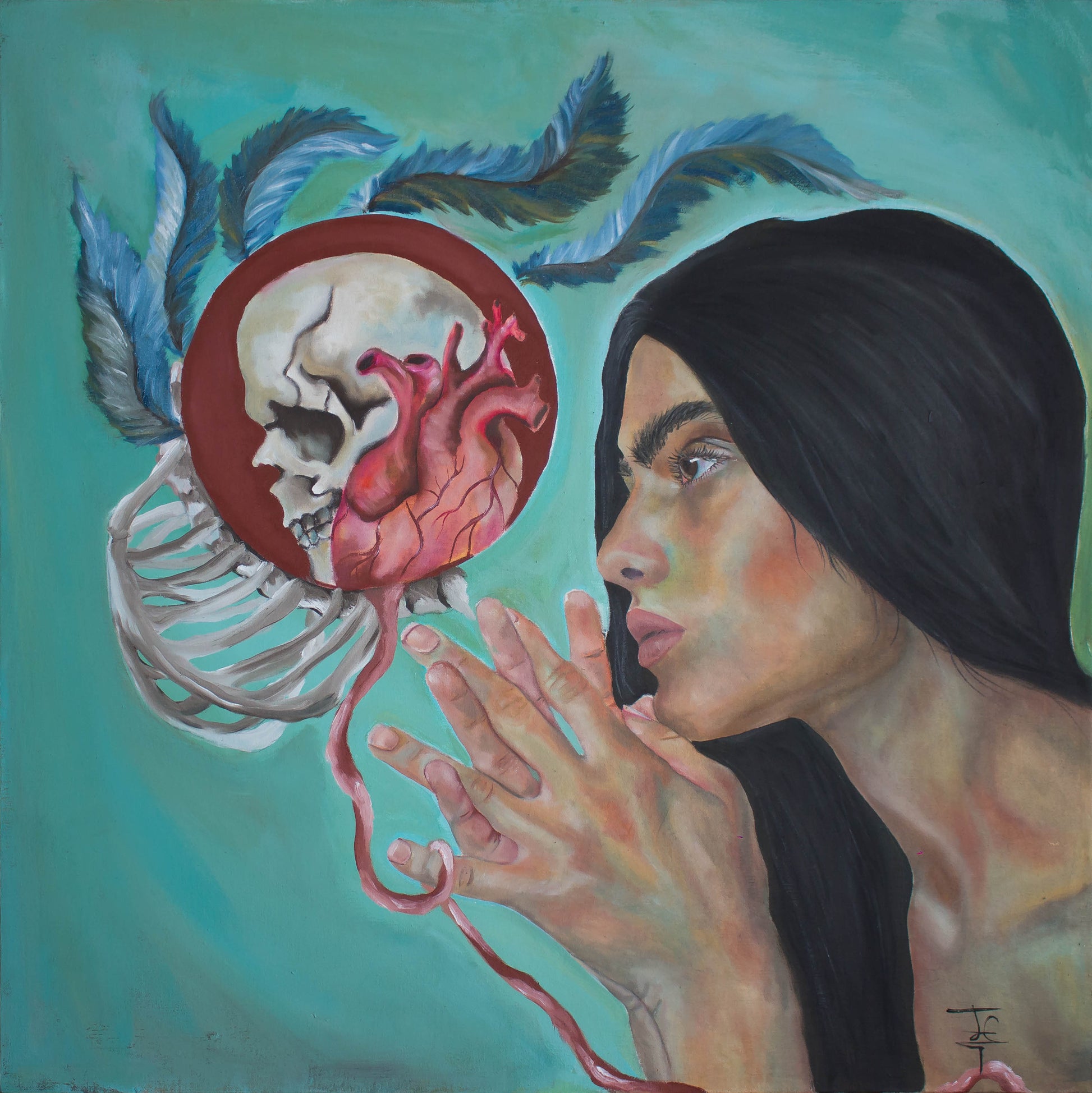 “Meditación sobre el Límite” es una obra profunda y provocadora de Fátima Cecilia, artista plástica originaria de San José del Pacífico, Oaxaca, que fusiona con maestría el realismo mágico y el neorealismo mexicano contemporáneo. Esta pintura retrata el instante íntimo en que una mujer observa, con intensidad contemplativa, el umbral entre la vida y la muerte, representado por una costilla flotante, un cráneo humano y un corazón palpitante, entrelazados con venas que conectan directamente con sus manos.